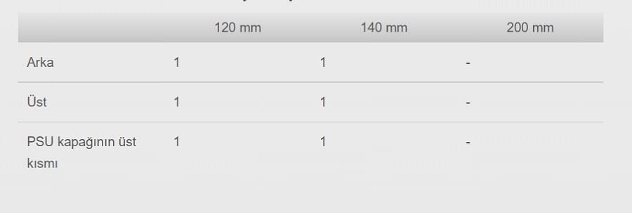 Yine bu fanlar da soğutmada etkili oluyor. İstenirse sıvı soğutma sistemini de yerleştirebileceğiniz seride, fanlar 140 mm olarak da kullanılabilir. Bunun da uyumluluk tablosunu hemen aşağı ekleyeceğim. Ayrıca PSU üzerinde de bir fan kullanabiliyorsunuz belirtmiş olayım.