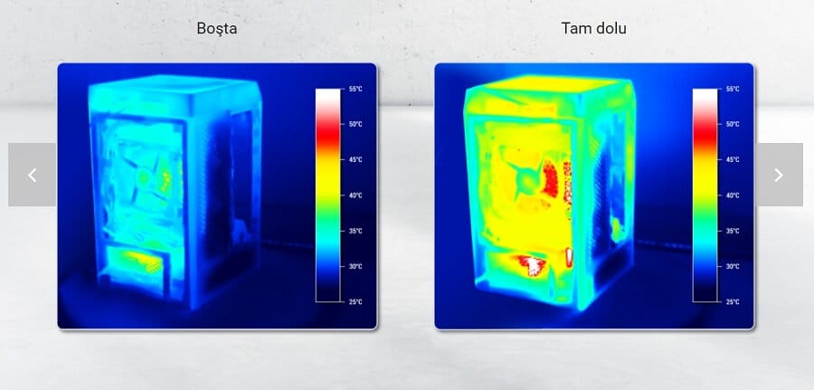 Bu da soğutma performansına doğrudan etki demek. Ek olarak kasada bir üst kısımda bir de arka kısımda olmak üzere 120 mm iki adet fan var. Üst egzoz ve arka egzoz diyebiliriz.