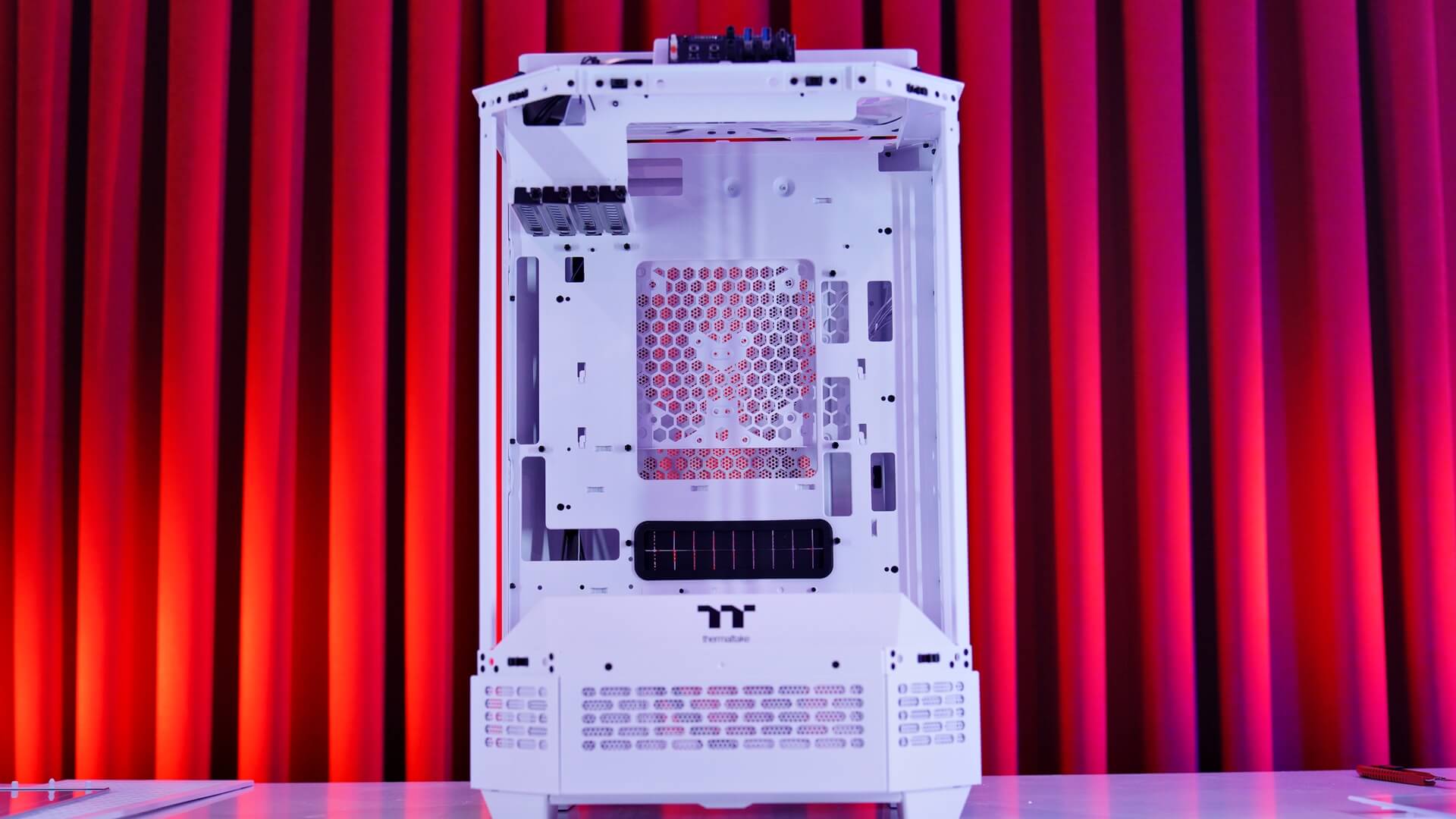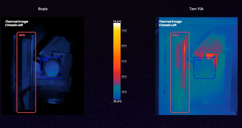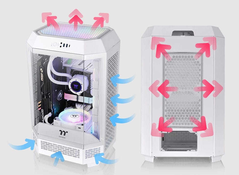 Tower 300 için belki en önemli görebileceğimiz kısımların başında tabii ki hava akışı ve kasanın termal verimliliği geliyor. Marka burada güzel bir ayarlama yapmış. Yan ve alt kısımlarda hava girişi sağlanırken, üst ve arka kısımda ise egzoz çıkış sağlanmış. Hava akışı için doğrudan Thermaltake tarafından yapılan termal verimlilik testleri de var. Markanın söylediğine göre kasanın içerisinde aşağıda yer alan sistem toplanmış.