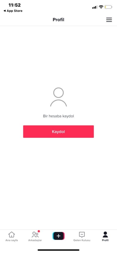 Profil sekmesine tıkladığımızda karşımıza kayıt ol butonu gelmekte tıklıyoruz.
