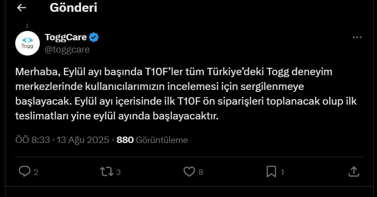 Bu süreçte TOGG deneyim merkezleri de hareketlenecek. Eylül’ün ilk haftalarından itibaren, T10F’i bizzat görmek, içine oturmak ve teknolojisini yakından incelemek isteyenler deneme imkanı sağlayabilecekler.