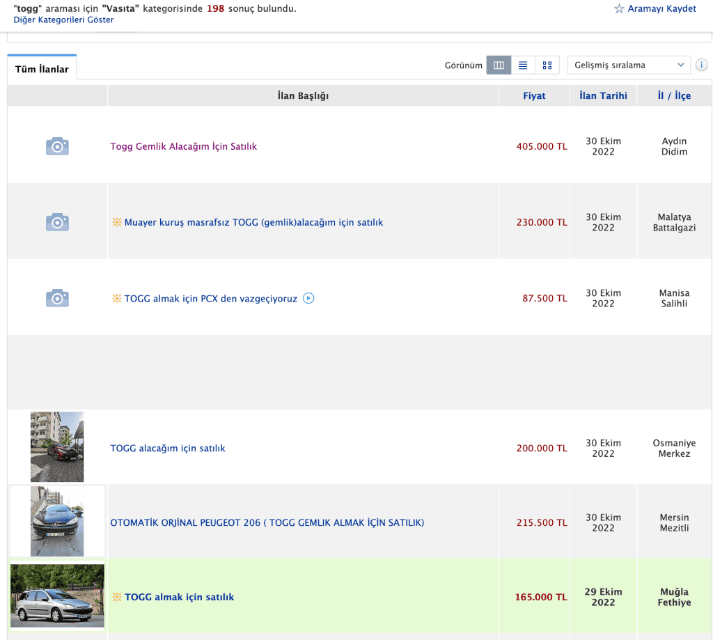 (Herhangi bir reklam içermiyor) Sahibinden.com üzerinde "Togg" kelimesini arattığımız zaman otomobil (vasıta) kategorisinde 150'den fazla ilanın yer aldığını ve çoğu ilanın ise Togg otomobil satın alabilmek için açıldığını rahatlıkla görebiliyoruz. Tabi ki Togg almak için sadece arabasını satanlar değil, evlerini de satışa koyan insanlar mevcut.
