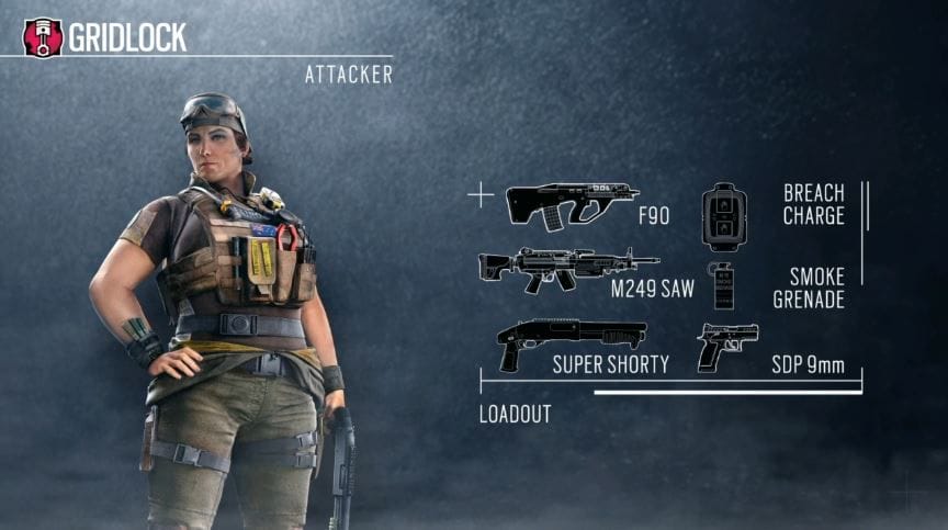 Güncellemeyle beraber gelen yeni atak operatörü Gridlock, 3 speed, 1 armora sahip. Karakterimiz ana silah olarak F90 ve 8x dürbünü olan M249 kullanıyor. Tekli olarak ise Super Shorty pompalıyı ve SDP 9mm tabancayı kullananan Gridlock için yan ekipman olarak ise Breach Charge ve Smoke Grenade seçebiliyoruz.