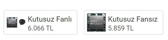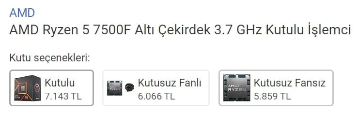 Aşağıdaki AMD Ryzen 5 7500F örneğine bakarsanız kutulu model ile kutusuz tray model arasında