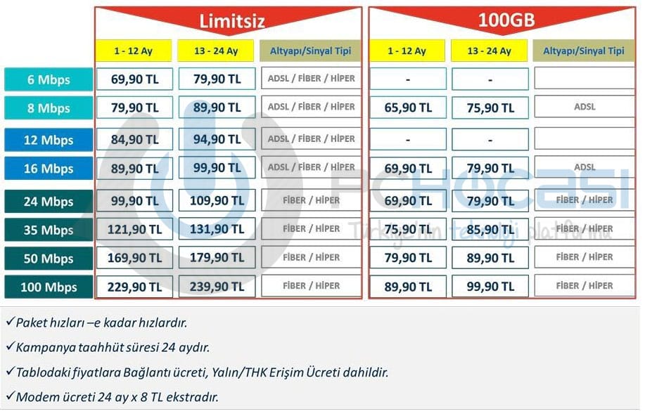 Türk Telekom hem limitsiz hemde 100GB'lık paketlerinde indirime gitti. Bakacak olursan 16Mbps'lik internetin fiyatı 90-100 TL civarında. Arkasından gelen 24Mbps'lik internetin fiyatı 100-110 TL olurken, 35Mbps'lik internet ise 120-132 TL civarında seyrediyor. Ülkemizde çoğunlukla bu internetlerin kullanııldığını düşünürsek fiyatların biraz fazla olduğunu söyleyebiliriz.