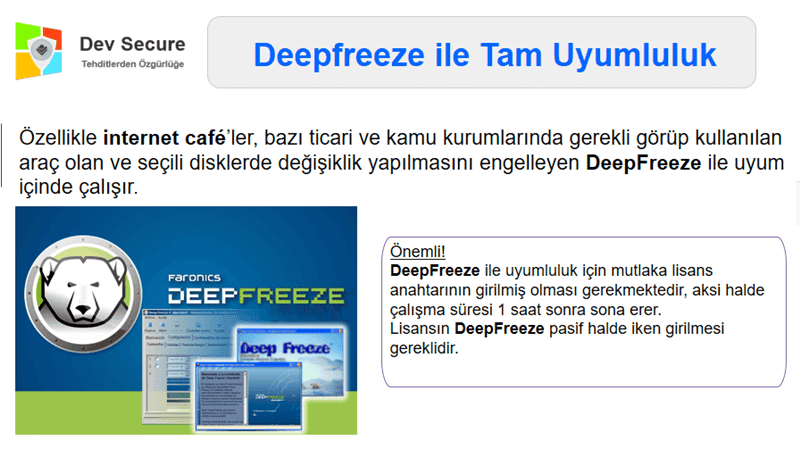 Kötü amaçlı yazılımlar ve virüslere karşı geliştirilen Dev Secure bizlere USB, CD ve kart girişlerini güvenlik kalkanı ile gerçek zamanlı olarak denetlemeye yarıyor. Tüm tehlikelere karşı müdahalede bulunduğu gibi, sizden gizli olarak hareket eden Autorun, Bittorrent ve Ceko gibi exe, virüs ve solucanları tespit ederek ya karantinaya alıyor, ya da tamamen kaldırarak tam koruma sağlıyor.