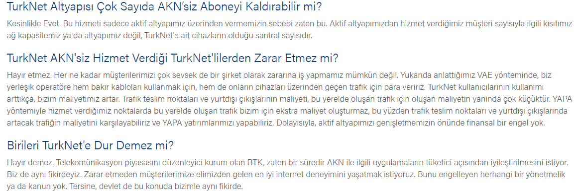 Öte yandan kapasitesini başka operatörler ile paylaşmayan Turknet ağı da bu sayede ihtiyaç doğrultusunda kapasiteyi istediği gibi arttırabiliyor. Ne kadar müşteri, o kadar AKN'siz internet diyebiliriz. Şirket YAPA yöntemi ile hizmet verdiği müşterilere sınırsız internet keyfi sunuyor. Ancak yukarıdaki belirtilen illerin dışında henüz hizmet verilmiyor.