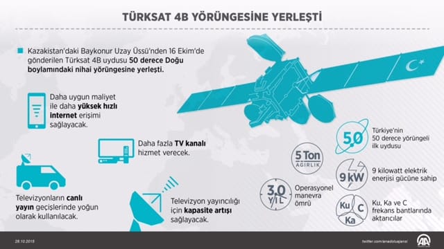 Bakan Binali Yıldırım, Kazakistanın Baykonur Uzay Üssü üzerinden 16 Ekim 2015'de fırlatılan Türksat 4B uydusunun Türksat AŞ'ye yörüngeye ulaştığını, yerli uydunun 50 basamaktaki doğu meridyenin deki son yörüngesine 24 Ekim tarihinde yerleştiğini açıkladı.