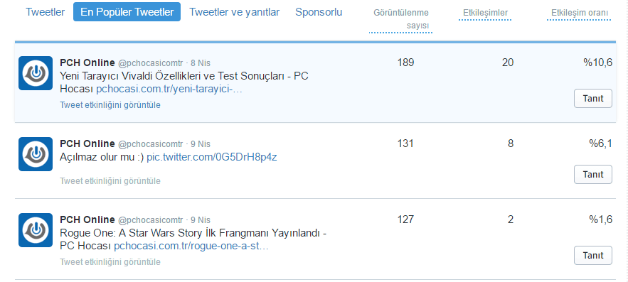 Attığınız twitlerde en popüler olanları sıralamakta. Görüntülenme ve etkileşim oranlarını size sıralam ile belirtmekte.