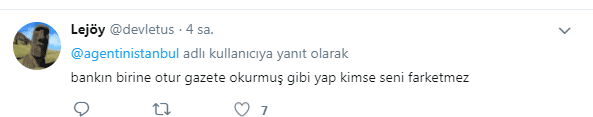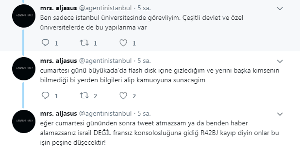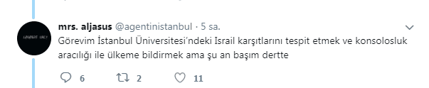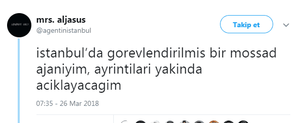 Bu sabah saatlerinde Twitterda mrs. aljasus takma adını kullanan bir hesap İsrail İstihbarat örgütü Mossad'da çalıştığını ve İstanbul üniversitesin de İsrail karşıtlarını belirleme görevi olduğunu idda etmesi üzerine Twitter kullanıcıları atılan tweetlere bir birinden ilginç cevaplar verdi.