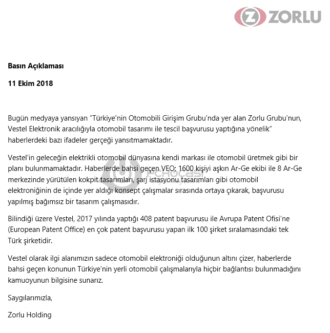 Bugün medya üzerinde yansıyan "Türkiye'nin Otomobili Girişim Grubu'nda yer alan Zorlu Grubu'nun Vestel Elektronik aracılığı ile otomobil tasarımı ve tescil başvurusu yaptığına yönelik" haber ve ifadelerin hiç biri gerçeği yansıtmamaktadır. Vestel'in geleceğin elektrikli otomobil dünyasında kendi markası ile ilgili otomobil üretme gibi bir planı da bulunmamaktadır.