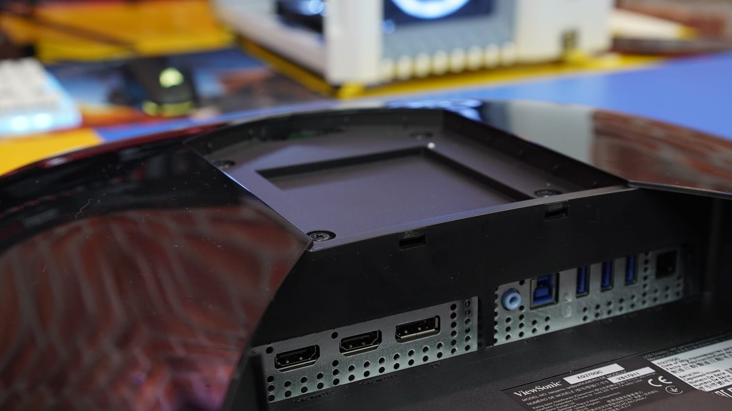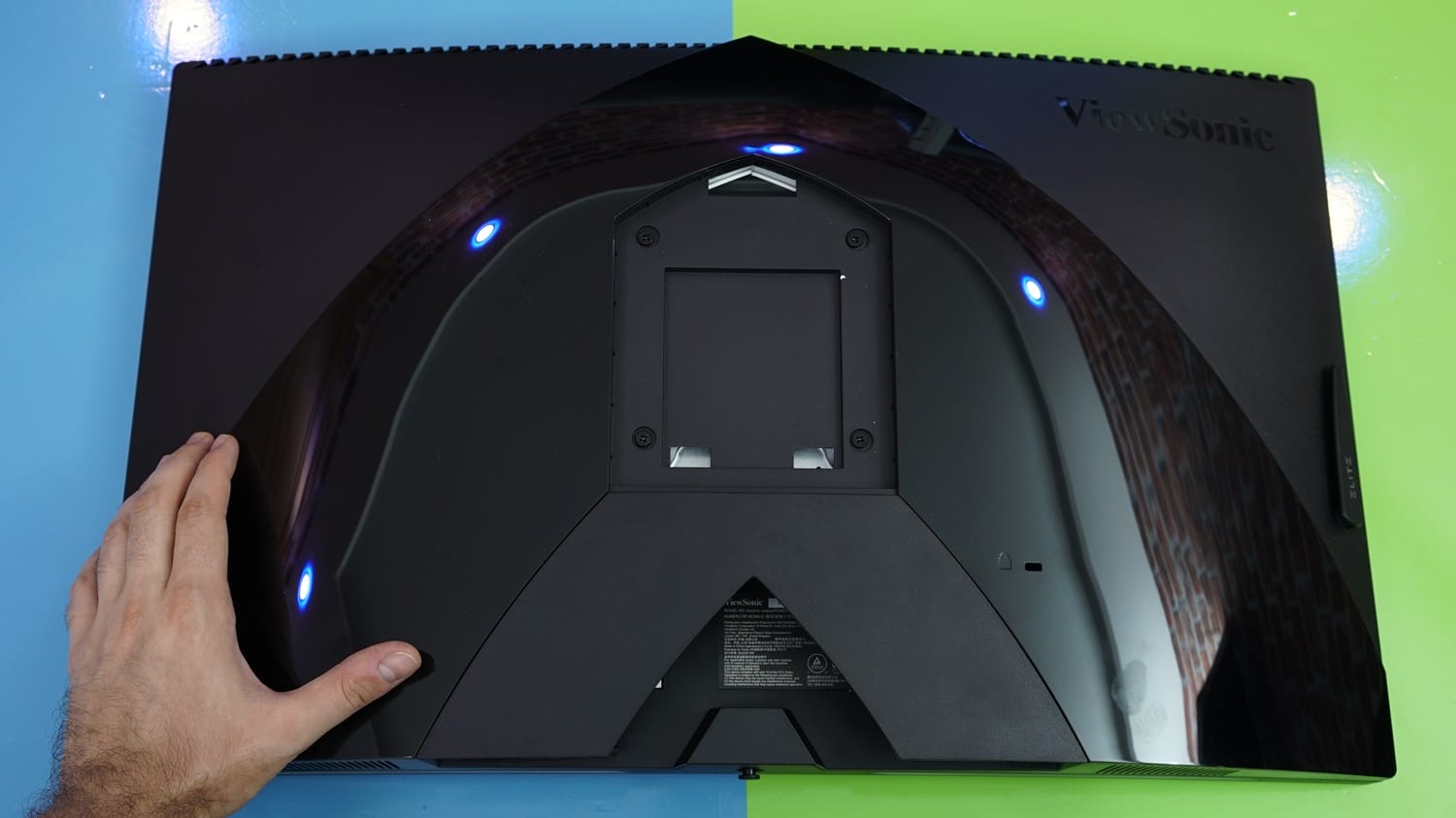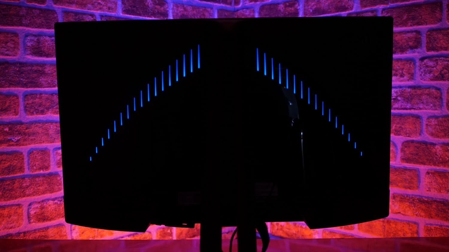 Ürünün arka yüzünü çevirdiğimizde ise parlak siyah yüzeyin daha fazla kullanıldığı bir alan oluşturulmuş. Üst kısımda her iki yana doğru alçalan ve sanki yukarı ok işareti anlamına gelen bu alanda RGB aydınlatmalı şeritler bulunmakta. Tasarıma farklı bir estetik kazandıran bu detay her ne kadar monitörün çok görülmeyen yüzünde olsa da, aydınlatma düşkünü kullanıcılar için önemli bir detay olmuş. Ayrıca bağlantı giriş çıkışlarını kapatmak isterseniz diye o alana da bir kablo gizleyici kapak eklenmiş durumda.