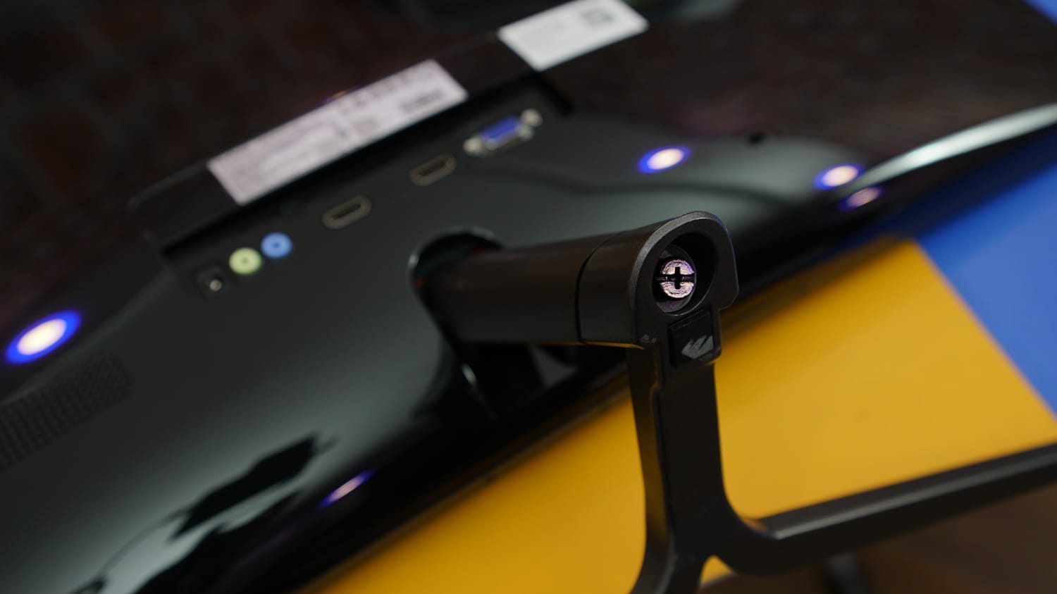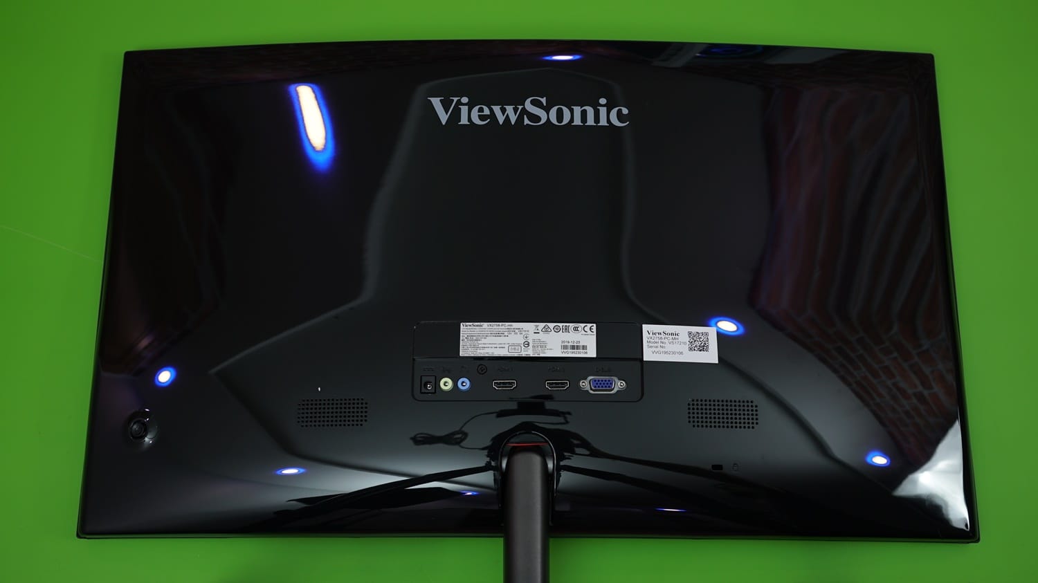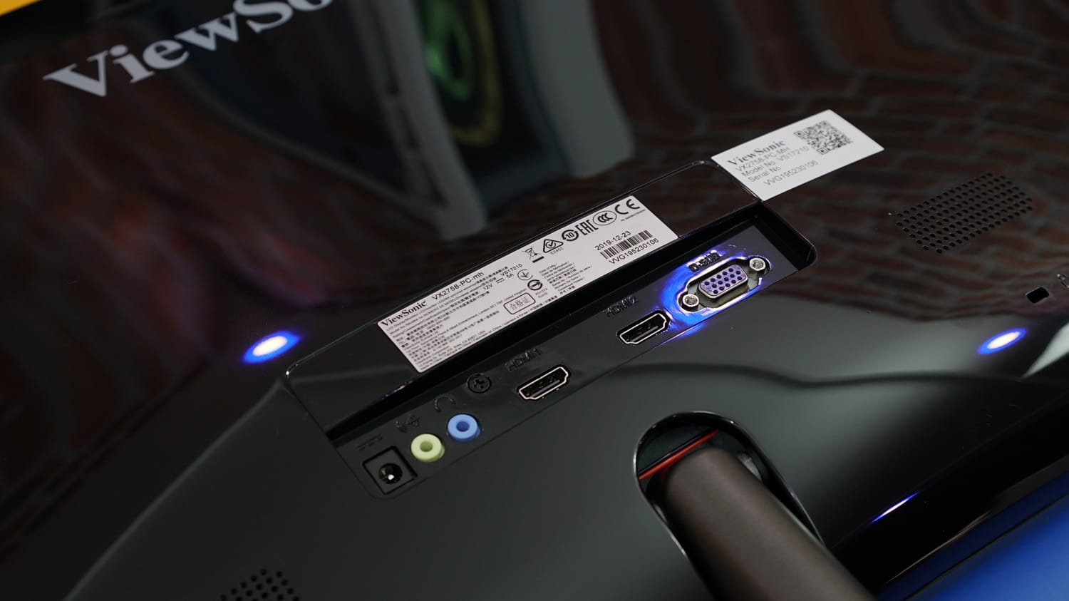 Monitörün arka kısmını çevirdiğimizde parlak malzemelerin çok daha dikkat çekici göründüğünü söyleyebiliriz. Arka alanda en üstte ViewSonic logosu bulunurken alt bölümde monitörün giriş çıkış portları konumlandırılmış. Bu portların sağ ve sol yanında ise iki küçük hoparlör görüyoruz.