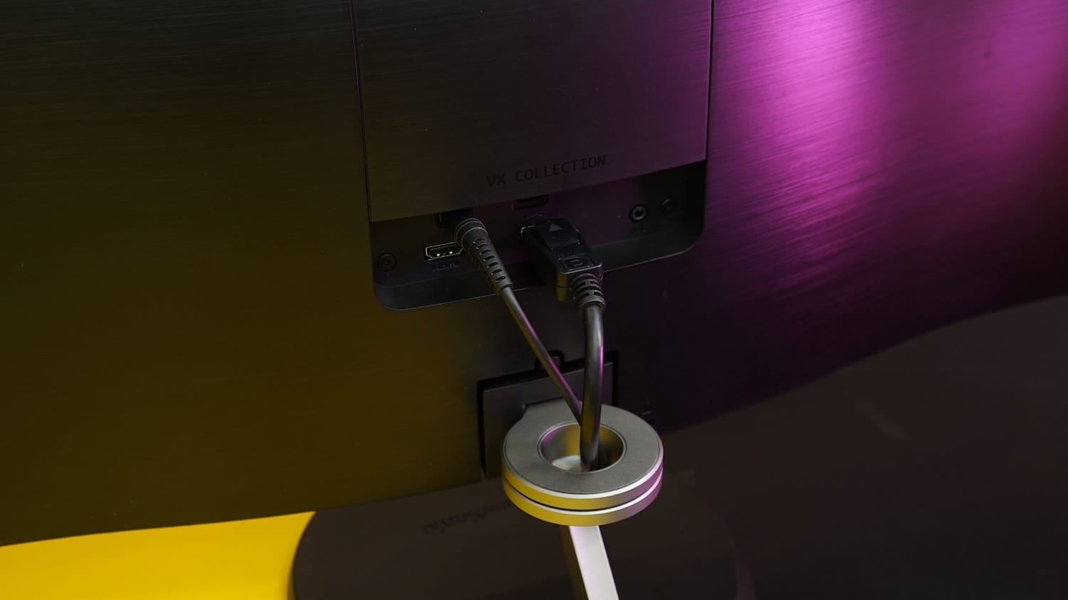 Monitörün giriş çıkışlarında bir adet güç girişi, bir adet Type-C girişi, HDMI, DisplayPort ve kulaklık çıkışı görmekteyiz. Bağlantı yuvaları panelin tam arkasında düz olarak konumlandırılmış. Duvar önü kullanımlarda bu tip bağlantı şekli problem teşkil ediyor olsa da, monitör standında kabloları güvenli mesafede tutabilmek için bırakılmış kablo kanalı mevcut. Dolayısı ile bu alanda herhangi bir sorun yaşanmıyor.