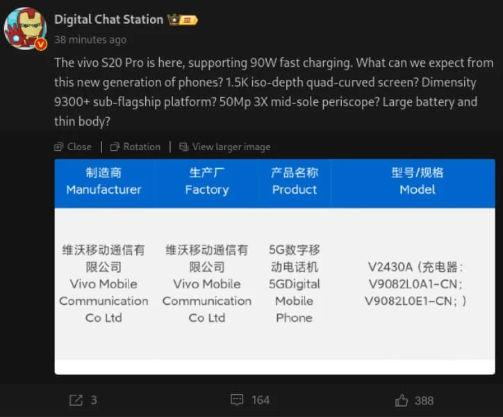 Sızıntı kaynağı Digital Chat Station'nın yapmış olduğu paylaşıma bakmış olduğumuz zaman Vivo S20 Pro'nun "V2430A" model numarası ile listenmiş olduğunu görmekteyiz. 3C sertfikasınısının alınmasıyla anlayabiliriz ki şirket yeni modeli üzerinde son düzlüğe girmiş durumda.
