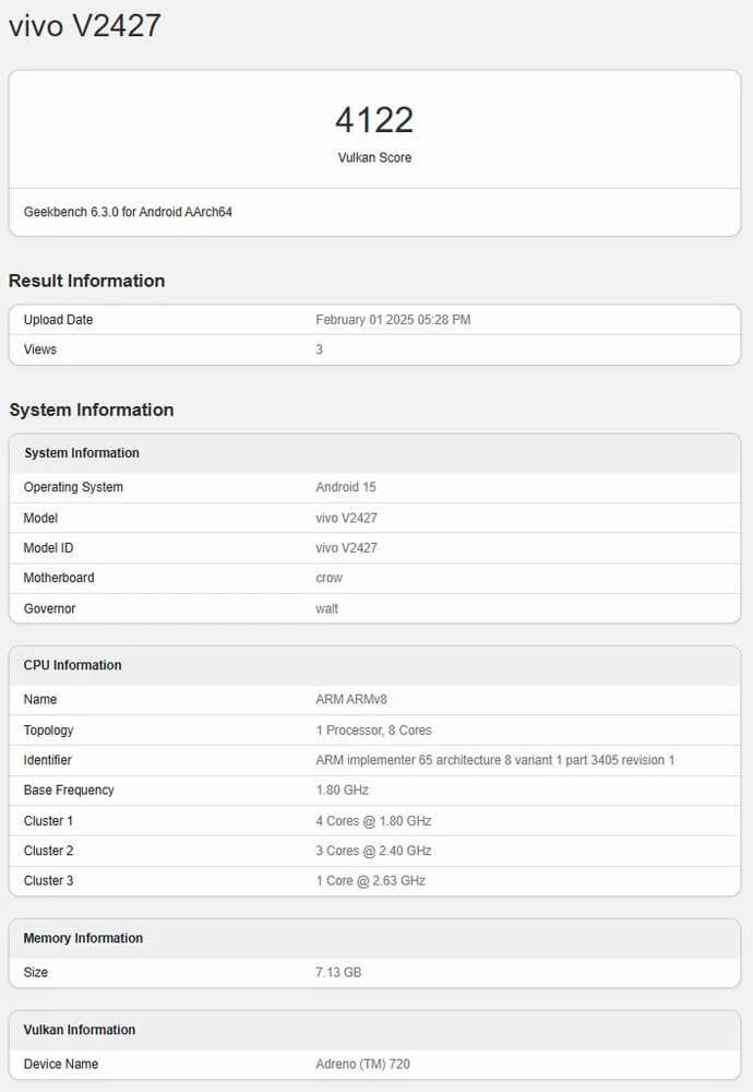 "vivo V2427"model numarası ile listelenen V50, tekli çekirdek testinden