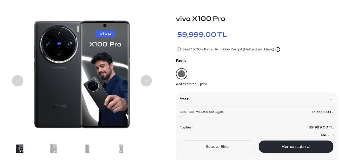 Gelişmiş kamera teknolojisine sahip tasarımı ve özellikleri ile ilgi duyulan X100 Pro modeli, vivo'nun resmi web adresinde 59.999 TL'lik fiyat etiketi ile kullanıcılara sunuluyor.