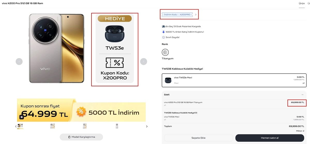 X200 Pro, Vivo'nun resmi web mağazasında satışa sunulmuş durumda. Normal fiyatı 69.999 TL olan modelin fiyatı, 5.000 TL'lik "X200 Pro" kuponu ile 64.999 TL'ye düşüyor. İndirim kuponu ile beraber şirket, TWS3e bluetooth kulaklığını hediye ediyor.