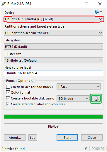 Daha sonraki adımda virüssüz olduğundan emin olduğunuz en az 8 GB hafızalı USB flashbelleğinizi bilgisayarınızın sağlam bir USB portuna takın. Ardından indirdiğiniz Rufus dosyasını (rufus-2.15.exe) çalıştırın ve yetki onayı verin. Daha sonra yukarıdaki resimde kırmızı ile işaretlenmiş alandan USB cihazınızı, yeşil ile işaretlenmiş (göremediyseniz "ISO Image"nin yanında) dosya seçme kısmından indirdiğiniz Ubuntu dosyasını seçin ve mavi ile işaretlenmiş Start tuşuna basın. UYARI - Disk Biçimlendirilecek benzeri bir uyarı göreceksiniz, bu yüzden dosyalarınız varsa bilgisayara atmanızı ve öyle başlamanızı öneririz.