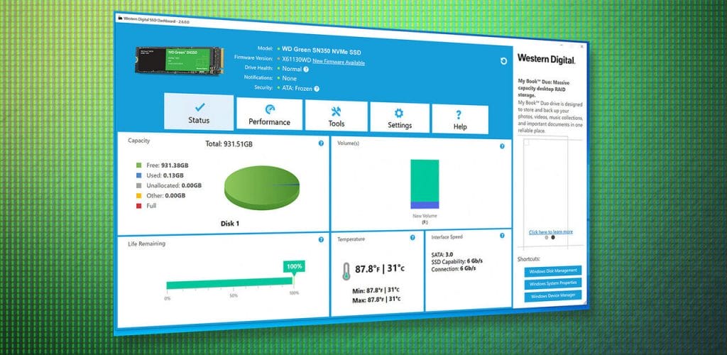 Western Digital SSD Dashboard'ı kullanarak WD Green SN350 sahipleri bu yazılımı SSD'nin performansı, depolama alanı, sıcaklığı ve diğer istatistikleri izlemek için kullanabilir.