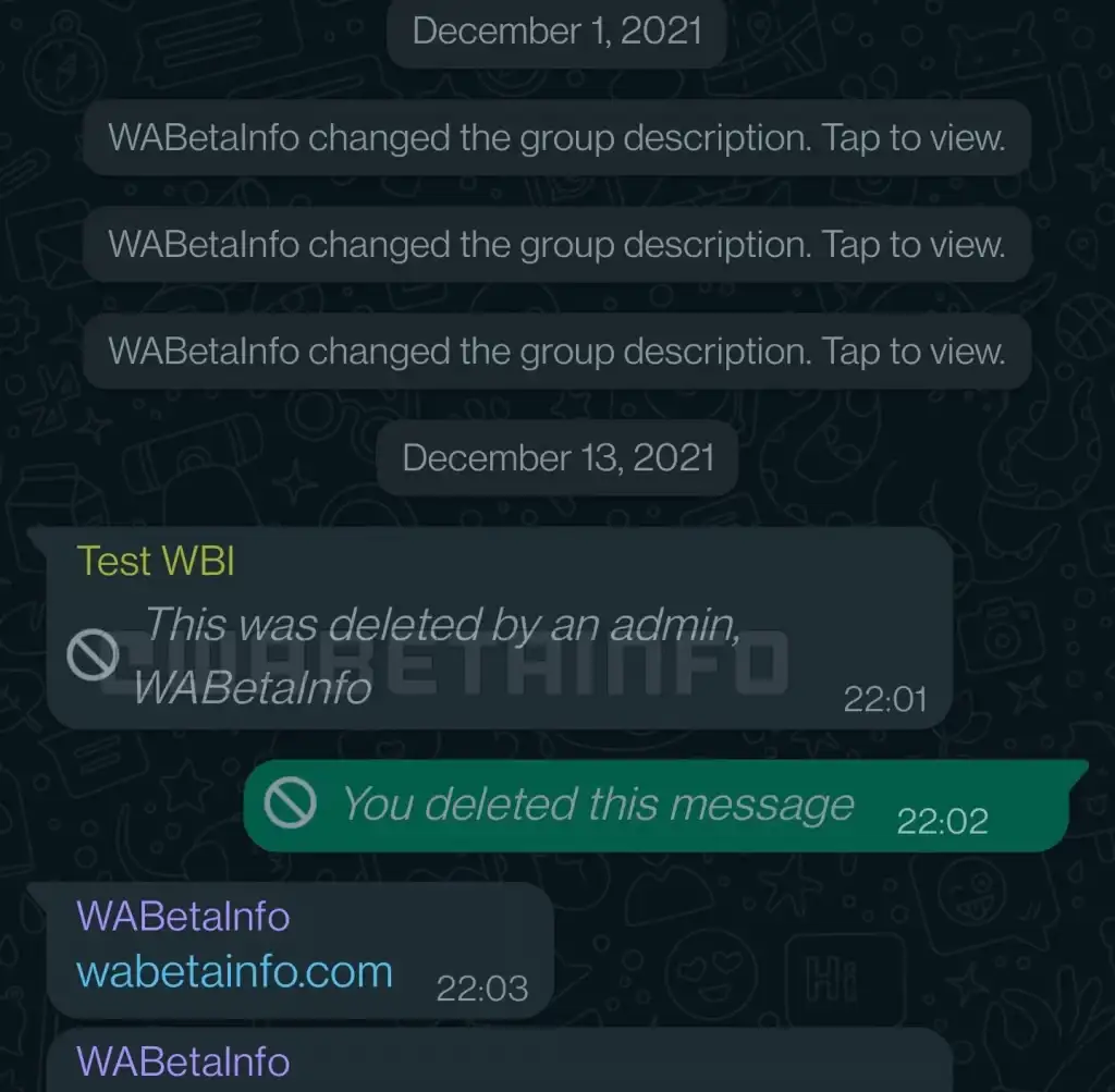 Meta şirketine ait popüler çevrimiçi mesajlaşma uygulaması WhatsApp, yakın zamanda başkaları tarafından gönderilenler de dahil olmak üzere herhangi bir mesajı grup sohbetinden silmelerine izin vererek grup yöneticilerinin yetkilerini arttırmaya çalışıyor. Henüz daha geliştirme aşamasında olan özellik, WABetaInfo tarafından Android 2.2.22.1.1 güncellemesi için en son WhatsApp Beta sürümünde keşfedildi.