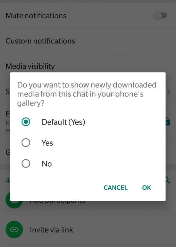 Eğer sürümünüzü güncellediyseniz, kişi bilgisi sekmesini açtığınızda direkt olarak "Medya Görünürlüğü" adlı yeni sekme sizi karşılıyor. Buraya tıklayarak kişiden gelecek medyaların galerinize otomatik olarak kaydedilip kaydedilmemesini ayarlayabilirsiniz. Bu özellik en çokta grup sohbetlerini sınırlamak için işe yarayacağa benziyor. Gelen medyaları otomatik olarak kaydetmeyi kullanan biriyseniz galerinizden sürekli temizlediğiniz medyaların en çokta grup sohbetlerinden geldiğini farketmişsinizdir. Eğer default olarak otomatik medya kaydetmeyi kullanan biri iseniz yeni güncelleme ile grup özelliklerine girerek oradan gelecek medyayı kaydetmemeyi seçebilirsiniz.