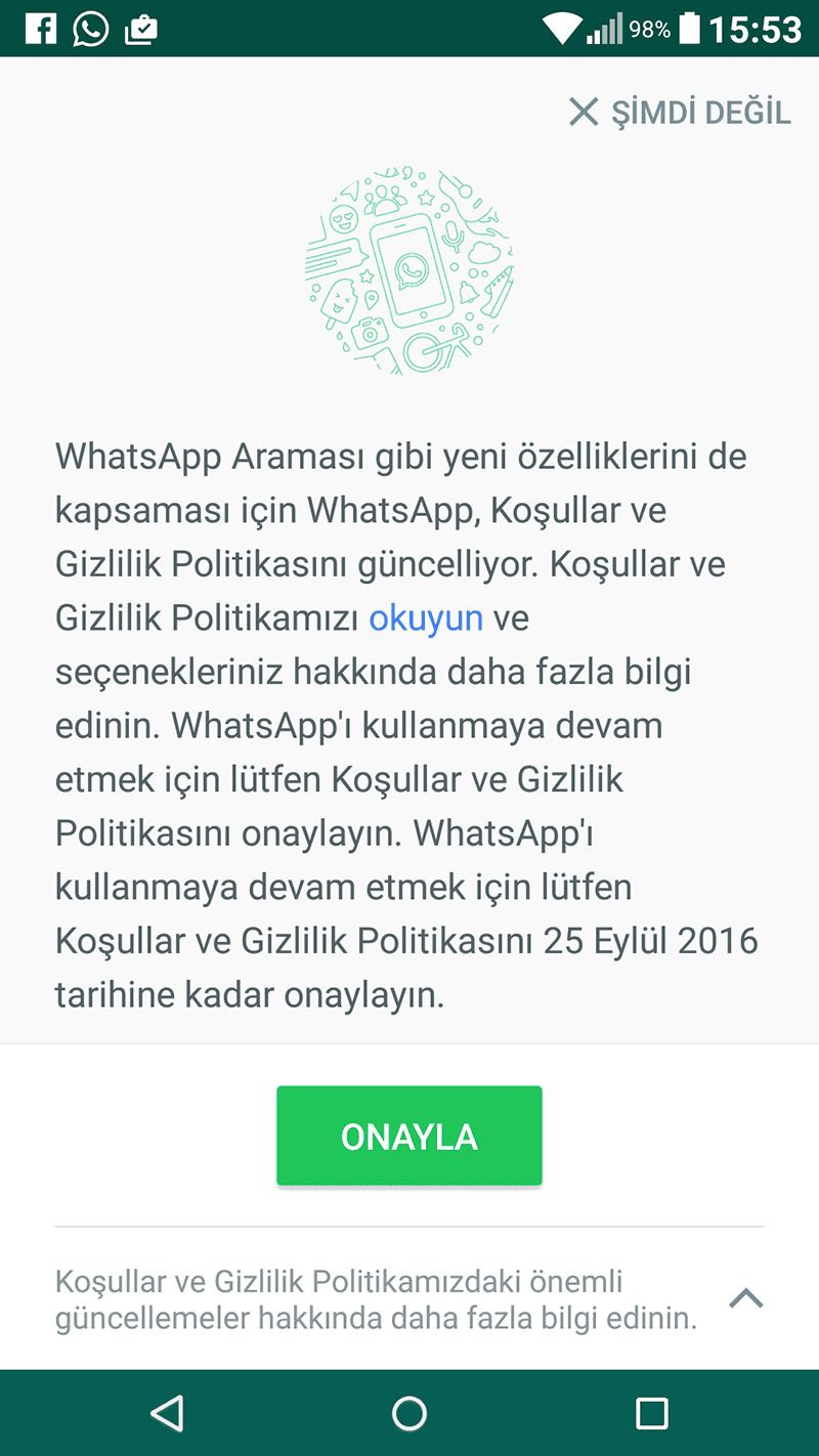 Eğer WhatsApp’in hesap bilgilerinizi paylaşma uyarısını ilk defa görüyorsanız bu yol ile iptal edebilirsiniz. Bildirimi gördükten sonra kullanım şartlarını okuya tıklayın. Şartların sonuna kadar ekranı aşağıya çekin ve “Facebook reklamlarını geliştirmek adına hesap bilgilerimi Facebook ile paylaş” seçeneğinin kutusunu kaldırıp onay butonuna basın.