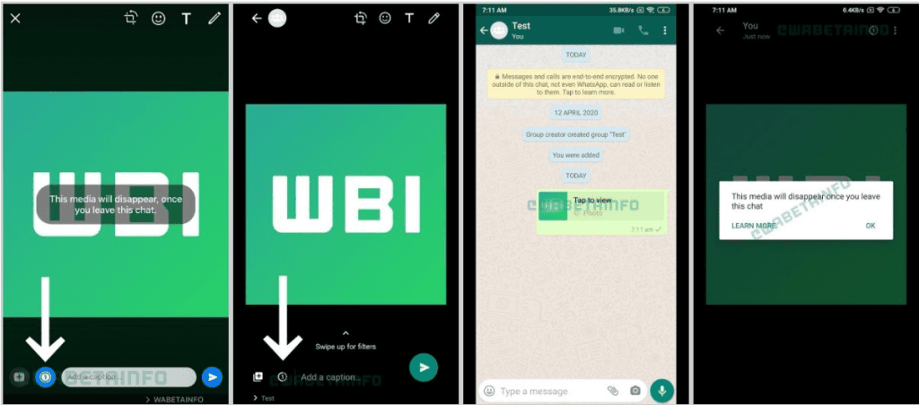 Kendi kendini yok eden mesaj özelliklerine benzer şekilde çalışan, kendi kendini yok eden görüntüler, önceden tanımlanmış bir süre sonra her iki taraf için de kaybolur. Ayrıca, bu mesajlar WhatsApp'tan dışa aktarılamaz. Aşağıdaki resimlerde de görebileceğiniz gibi, özellik kullanılabilir olduğunda, metin kutusunun hemen yanında bir geçiş göreceksiniz ve geçişe dokunduğunuzda, "Bu medya kaybolacak, siz bu sohbetten ayrılın."