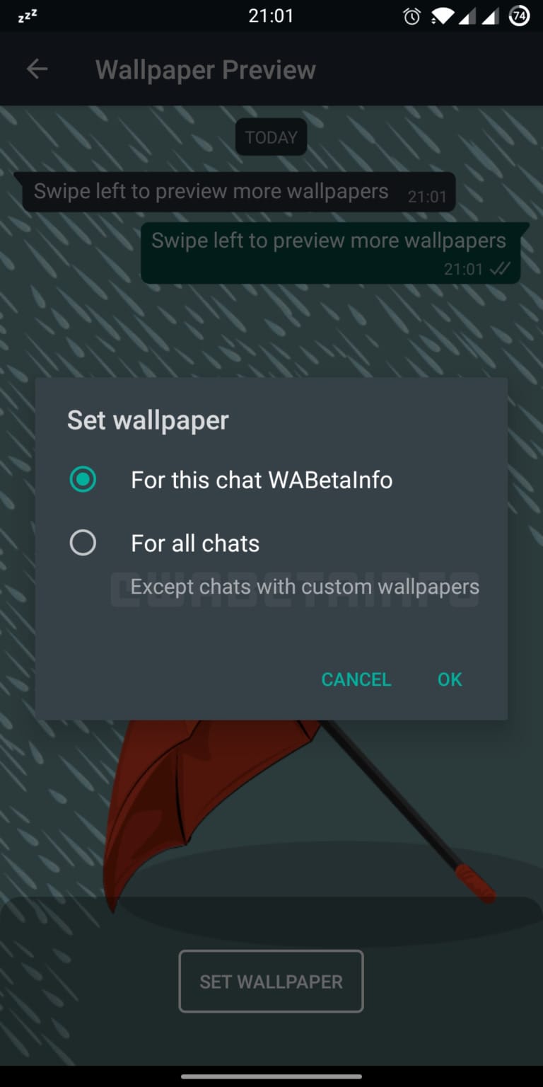 Yeni bir duvar kağıdı ayarladıktan sonra, sohbet mesajcısı size mevcut sohbet için duvar kağıdını mı yoksa genel olarak mı ayarlamak istediğinizi soracaktır (elbette, zaten özel bir duvar kağıdına sahip olanlar hariç). Duvar kağıtlarının opaklık seviyesini kontrol etmek ve WhatsApp Doodles eklemek de mümkün olacaktır. WABetainfo, bu özelliği ilk olarak Android için WhatsApp beta sürüm 2.20.200.11'de gördü.