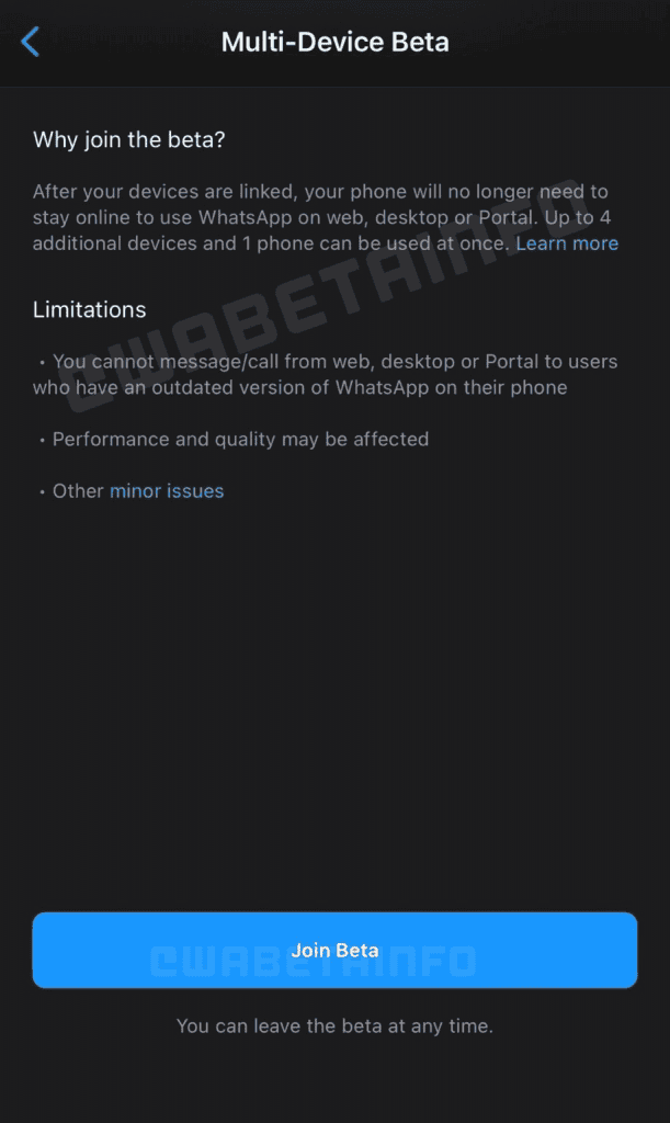 Olayı bilmeyenler için, çoklu cihaz desteği özelliği, kullanıcıların birden fazla cihazı (4 cihaza kadar) bağlamasına ve aynı anda kullanmasına izin verecek yeni bir kullanıcı deneyimi. Başka bir deyişle, diğer cihazlarda kullanmak için artık WhatsApp mobil uygulamasını açmanız gerekmeyecek, ana cihazınızı internete bağlamanız da gerekmeyecek.
