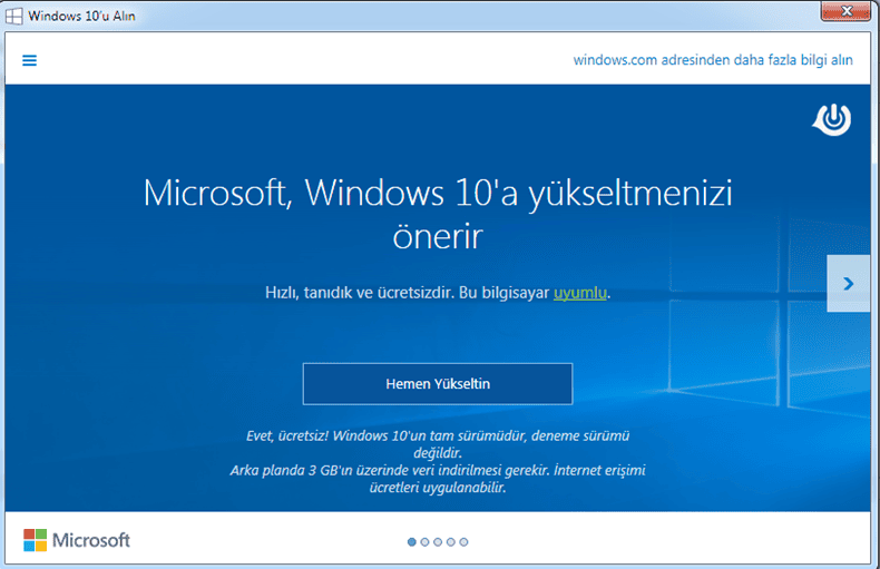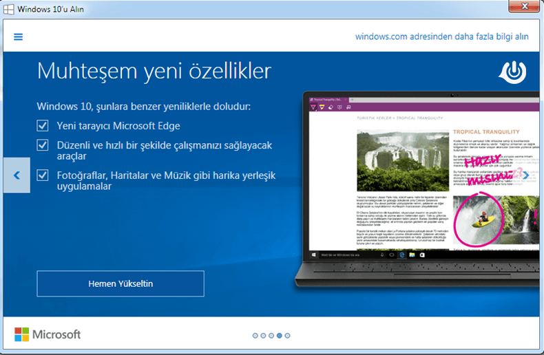 Her zamanki gibi güne mutlu bir start vermek istediğinizde "power" tuşuna basarak Windows'un açılışını beklediniz. Bir dakika içerisinde açıldıktan sonra sağ tarafta pat diye bir baloncuk görüyorsunuz: "Windows 10'a yükseltin". Sonra bu baloncuk peşinizi günlerce bırakmayarak illa sizi denemeye zorlayacak kadar taciz ediyor. Biz de onun kurbanlarından birisi olduk diyebilirim. Yaklaşık olarak on beş gün boyunca sağ tarafta çıkan baloncuk artık sinir bozmaya başlamıştı.