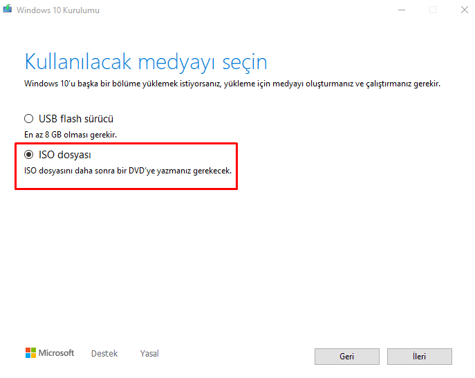 ISO dosyası seçeneği geliyor burada biz ISO dosyası seçeneğini seçiyoruz. Ve ardından bilgisayarımızda dosyanın nereye indirilmesi gerektiğini soruyor seçiyoruz.