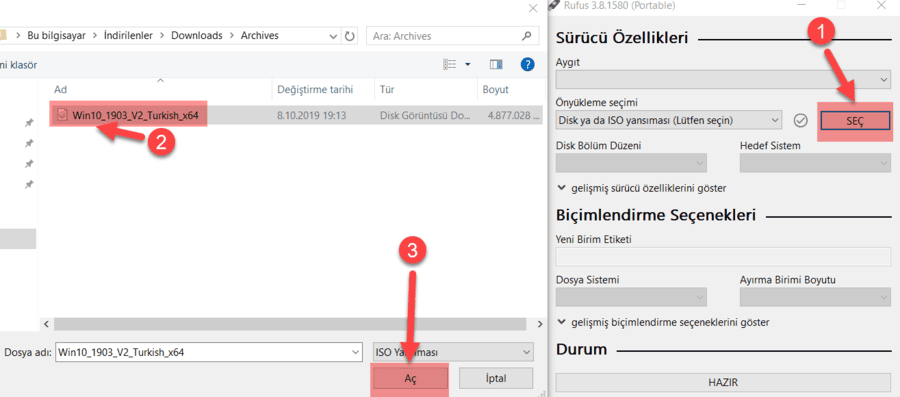 Seç kısmından indirdiğimiz iso dosyasını seçiyoruz. Program bilgisayarımıza takılı olan usb belleği