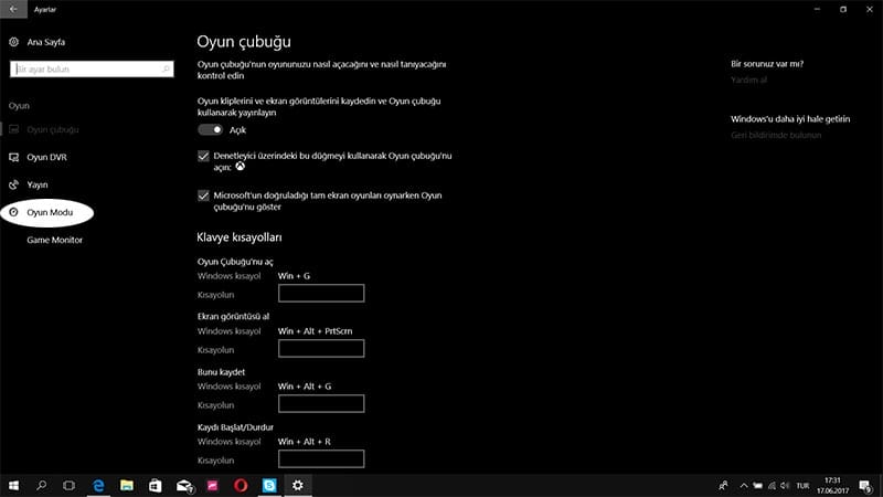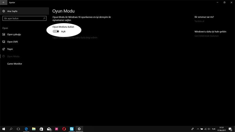Yan sekmeden Oyun Modu'nun sayfasını açarak aktif ediyoruz.