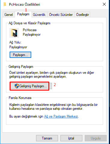 İzinleri ayarladıktan sonra iki kez tamam diyerek Özellikler penceresine dönün ve aşağıda gösterilen yerden Ağ Yolu adresini kopyalayın.