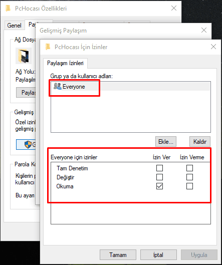 Everyone kullanıcısı seçtikten sonra aşağıda gösterilen kutu içerisinde ki ayarları dilediğiniz şekilde düzenleyin.