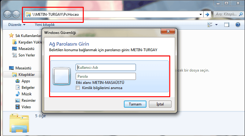 Sürücüye bağlanmak istediğiniz bilgisayardan yukarıda son adımda koplayadığımız adresi Windows Klasörde adres çubuğuna yapıştırın. Ardından ev sahibi bilgisayarda bulunan bir kullanıcı adı ve parolası ile oturum açın.