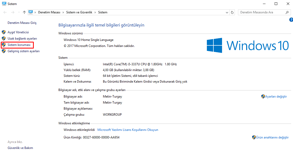 Bilgisayarıma sağ tıklayıp özellikler dedikten sonra Sistem Koruması kısmına basalım.