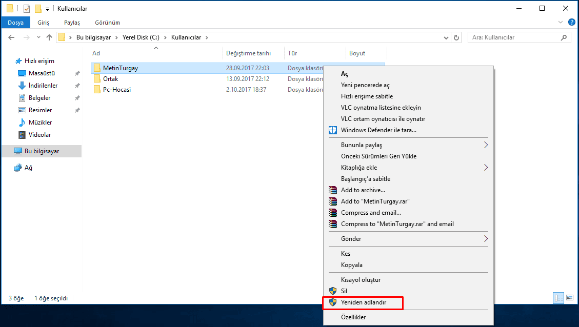 Bugün bahsedeceğimiz konu Windows 10 da kullanıcı adını değiştirme. Standart kullanıcı adından bahsetmiyorum, C:\Kullanıcılar kısmında ki klasör isminden bahsediyorum. Yeni format attıktan sonra Microsoft hesabı ile kurulum yaptığım için kullanıcı hesabım mail adresimin kötülüğünden dolayı saçma bir isim aldı ve beni rahatsız etti. Daha sonra bunu araştırırken birçok kişinin de aynı olaydan müzdarip olduğunu gördüm. Genel olarak Türkçe karakterlerden dolayı sorun yaşayanlar olmuş, hal böyle olunca bu sorunu nasıl çözdüğümü sizlere aktarmak istedim.