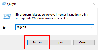 Windows + R tuşu ile Çalıştır penceresini açıp regedit yazın ve Tamam'a basın.