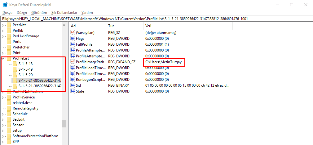 Açılan Kayıt Defteri penceresinde HKEY_LOCAL_MACHINE\SOFTWARE\Microsoft\Windows NT\CurrentVersion\ProfileList klasörünü bulun. ProfileList klasörünü genişlettikten sonra sol taraftaki klasörlerden değiştirmek istediğiniz kullanıcıya ait olanı sağ taraftan bakarak bulun.