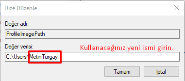 Değiştireceğiniz klasörü bulduktan sonra ProfileImagePath kısmına çift tıklayın ve açılan yerde Değer Verisi kısmına C:\Users kısmına zarar vermeden sadece eski ismi silip yeni ismi yazın.