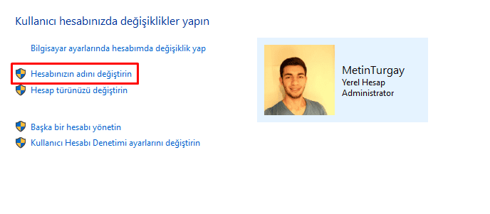 Denetim masasından kullanıcılar kısmına girerek hesabınızın adını yeni isim ile değiştirin.