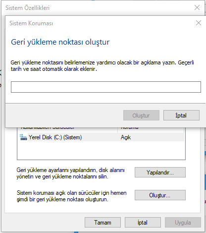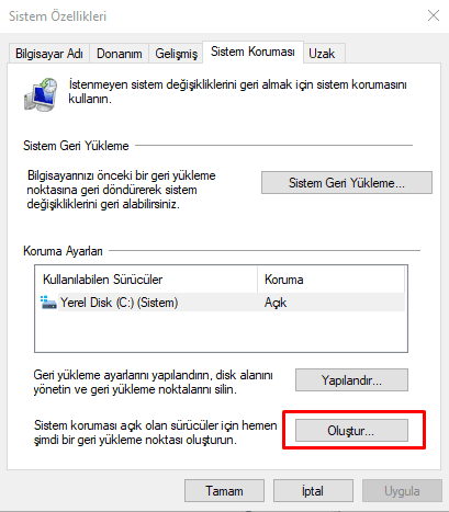 Sistem Geri Yükleme Noktası Oluşturma;