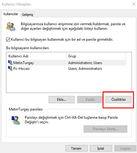 İsmini değiştirdiğimiz kullanıcıya tıklayıp Özellikler butonuna basın.