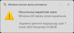 3600 yazıyoruz (3600, 1 saatin saniye cinsidir. Bu komudu yazdığınızda bilgisayarınız 1 saat sonrasında otomatik olarak kapanacaktır).