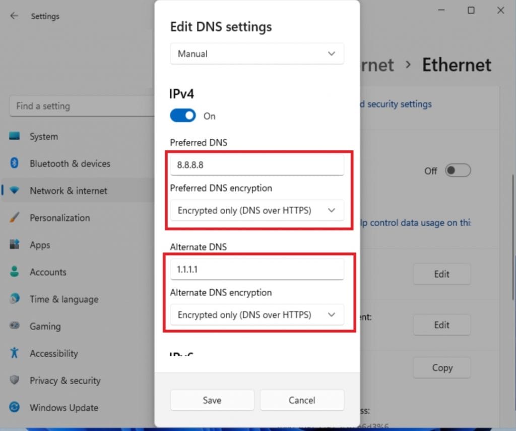 - Çıkan formda, Tercih Edilen DNS alanına 8.8.8.8 girin ve Yalnızca Şifrele (HTTPS üzerinden DNS) öğesini seçin.