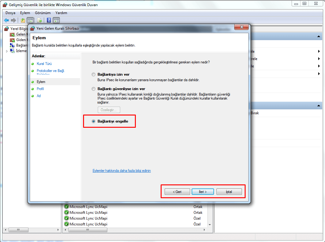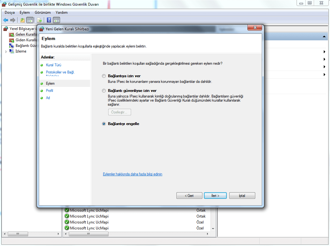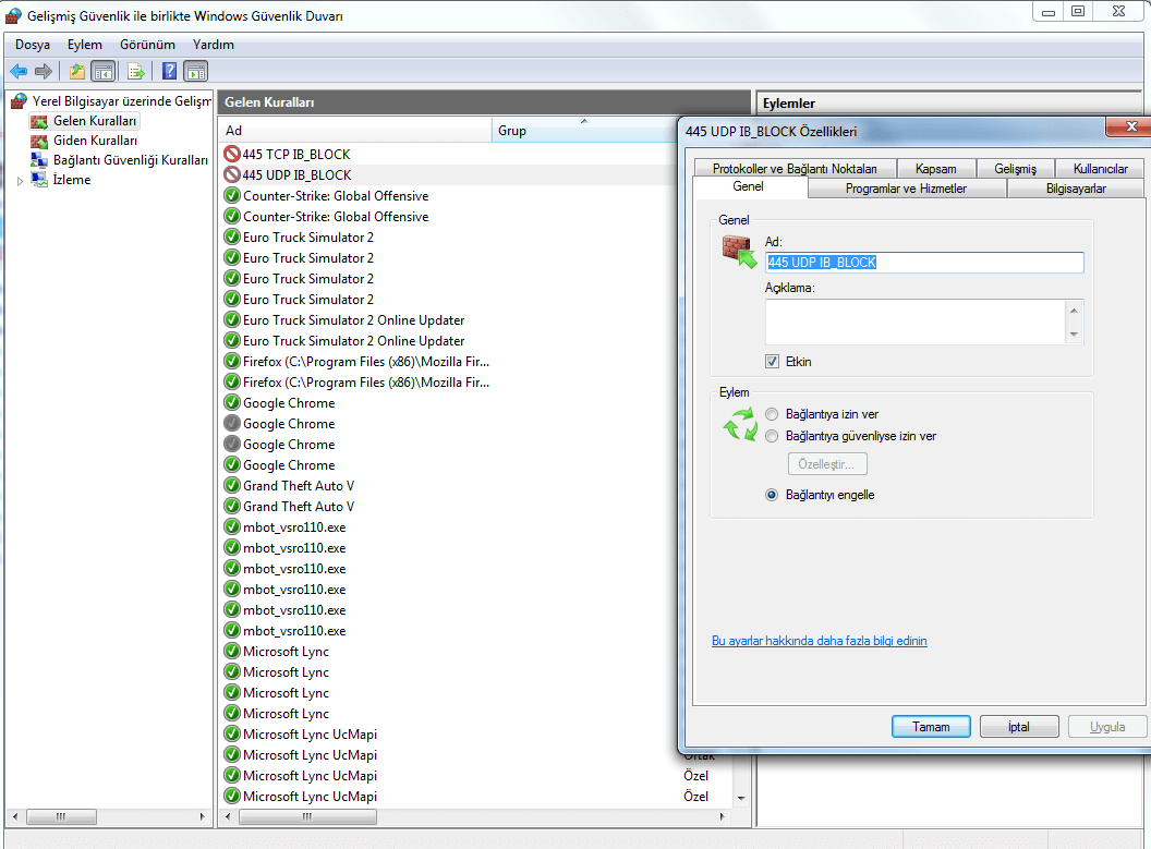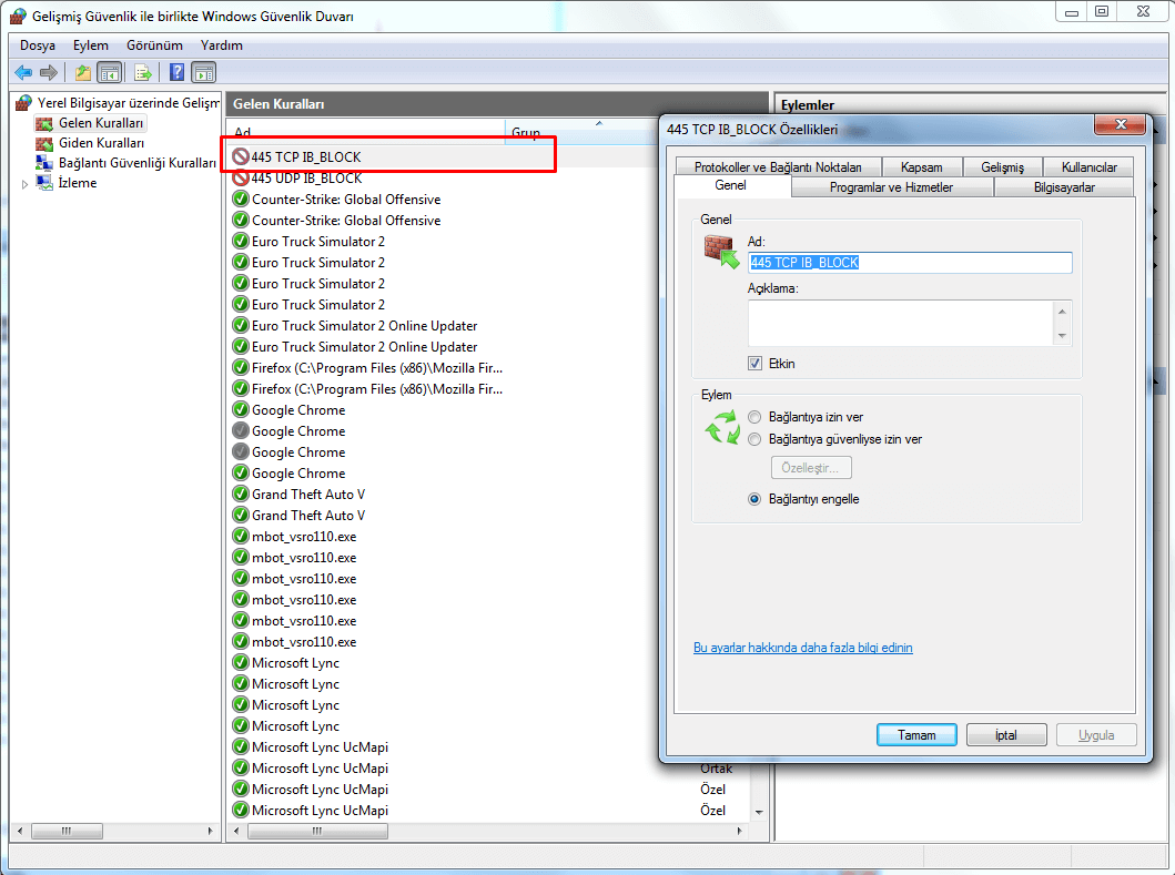 En son olarak Gelişmiş Güvenlik sekmesinde bloklamamızı gerçekleştirdik. Bu şekilde ilk işlemi tamamladıktan sonra hemen ikinci işlemimize geçiyoruz.