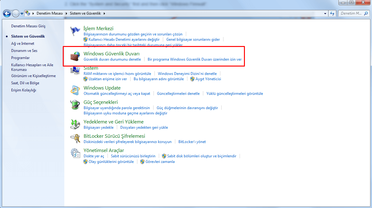 ❱ Başlat - Denetim masası seçeneklerine tıklayarak Windows Güvenlik Duvarı seçeneğine tıkayın.