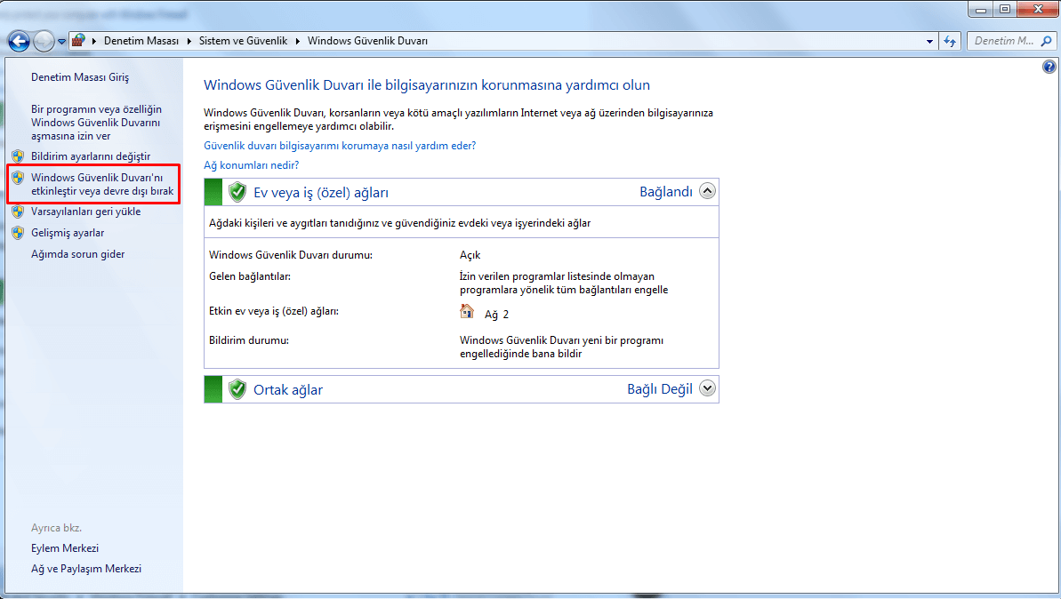 Windows güvenlik duvarı sekmesine giriş yaptıktan sonra 'Windows Güvenlik Duvarı'nı etkinleştir veya devre dışı bırak' seçeneğine tıklayarak işlemlere devam ediyoruz.